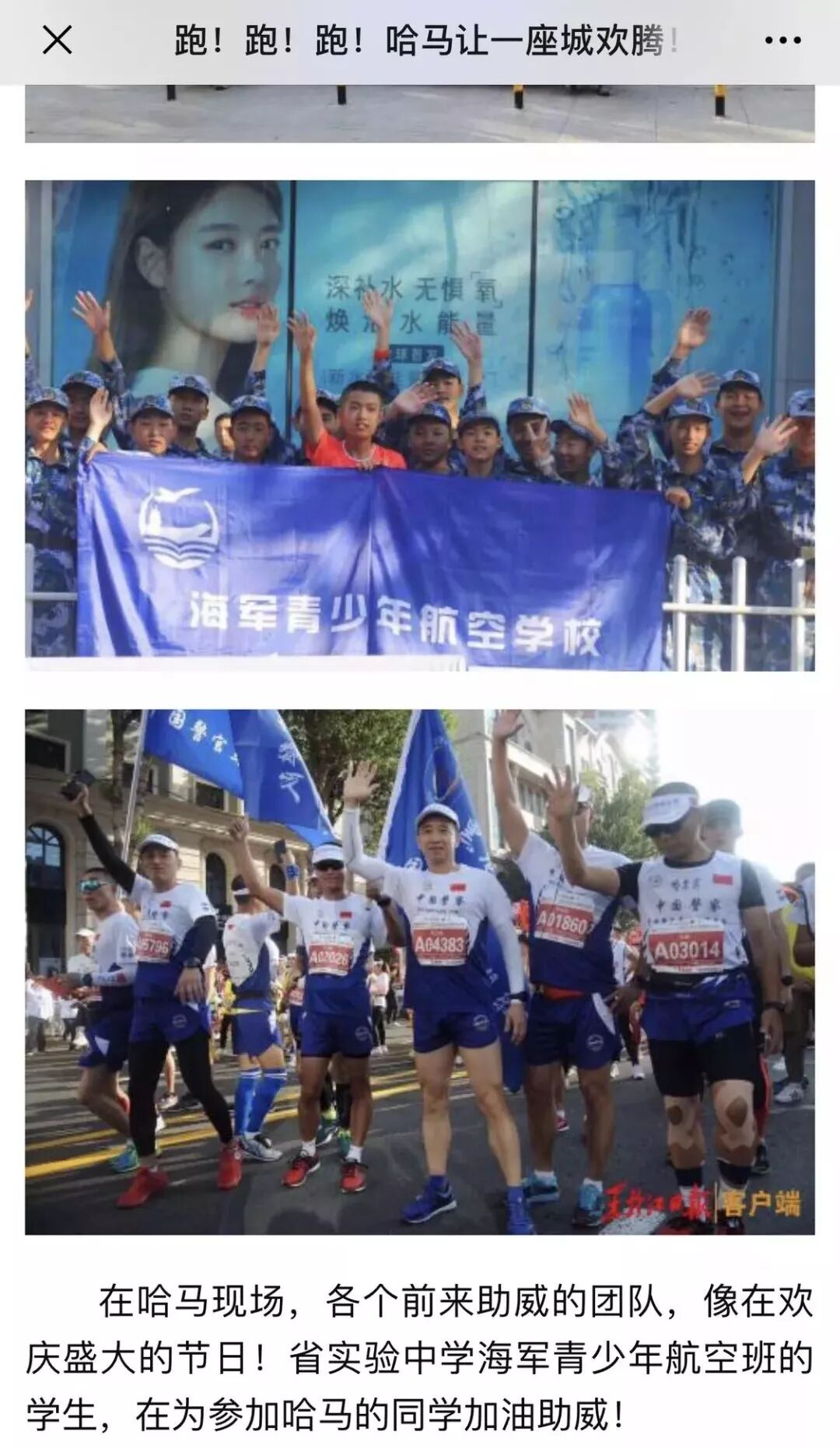 今天,我們2019級省實驗海航班亮相在馬拉松的現場(chǎng),我為(wèi)自己是首屆海航班的一員感到驕傲和(hé)自豪!雖然我們還(hái)是普通(tōng)的學生(shēng),但(dàn)我們的形象和(hé)精神不普通(tōng):我們穿着統一的海軍服裝走在賽場(chǎng)裏 ,我們站(zhàn)着整齊的隊伍,邁着統一的步伐走在賽場(chǎng)裏,我們聽(tīng)指揮聽(tīng)命令,懂規矩講紀律,迎來(lái)的是人(rén)們贊許的目光和(hé)信任。